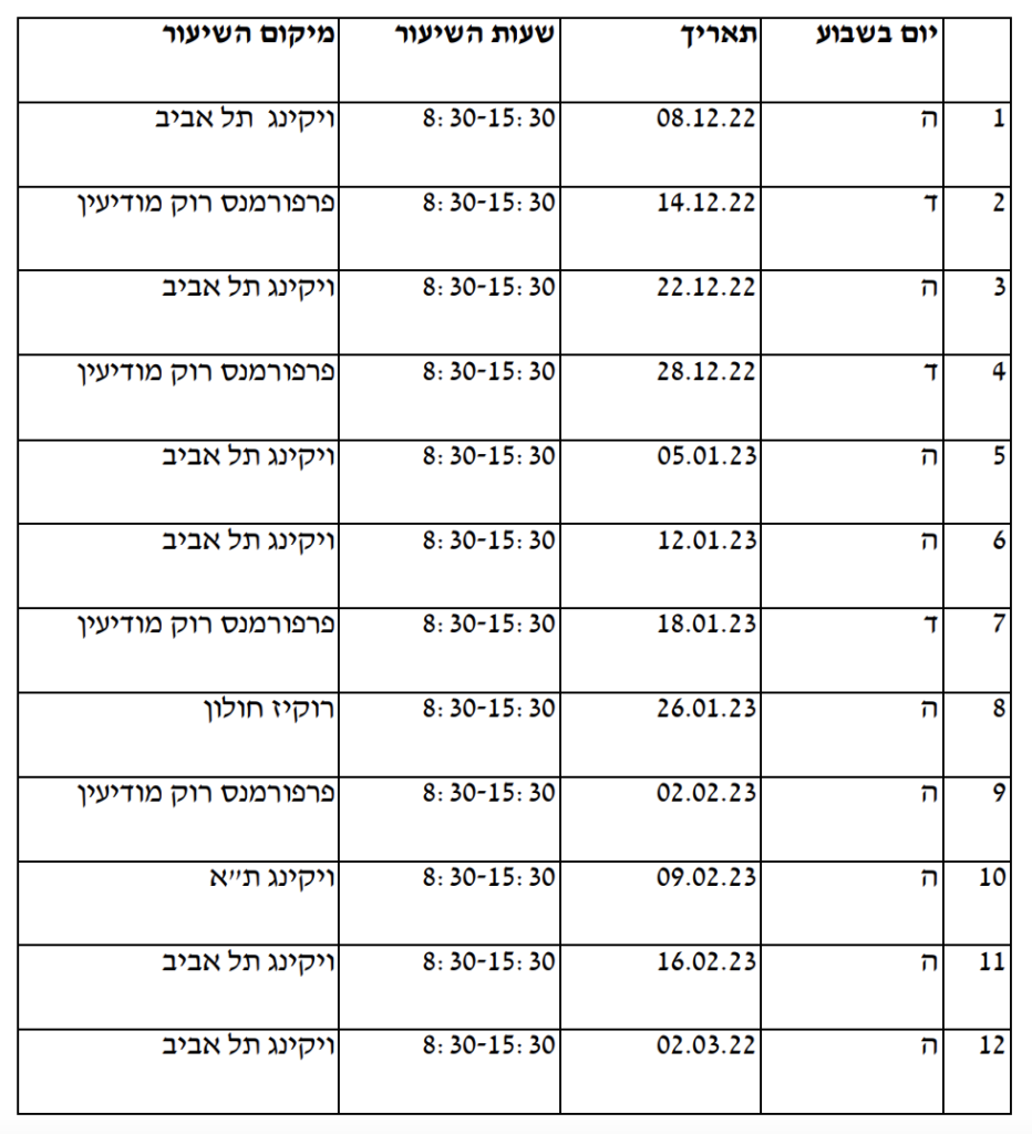 • סטאז’ – החניך יחויב בהדרכת 20 שעות סטאז’ בליווי מדריך טיפוס מוסמך (בקיר טיפוס).